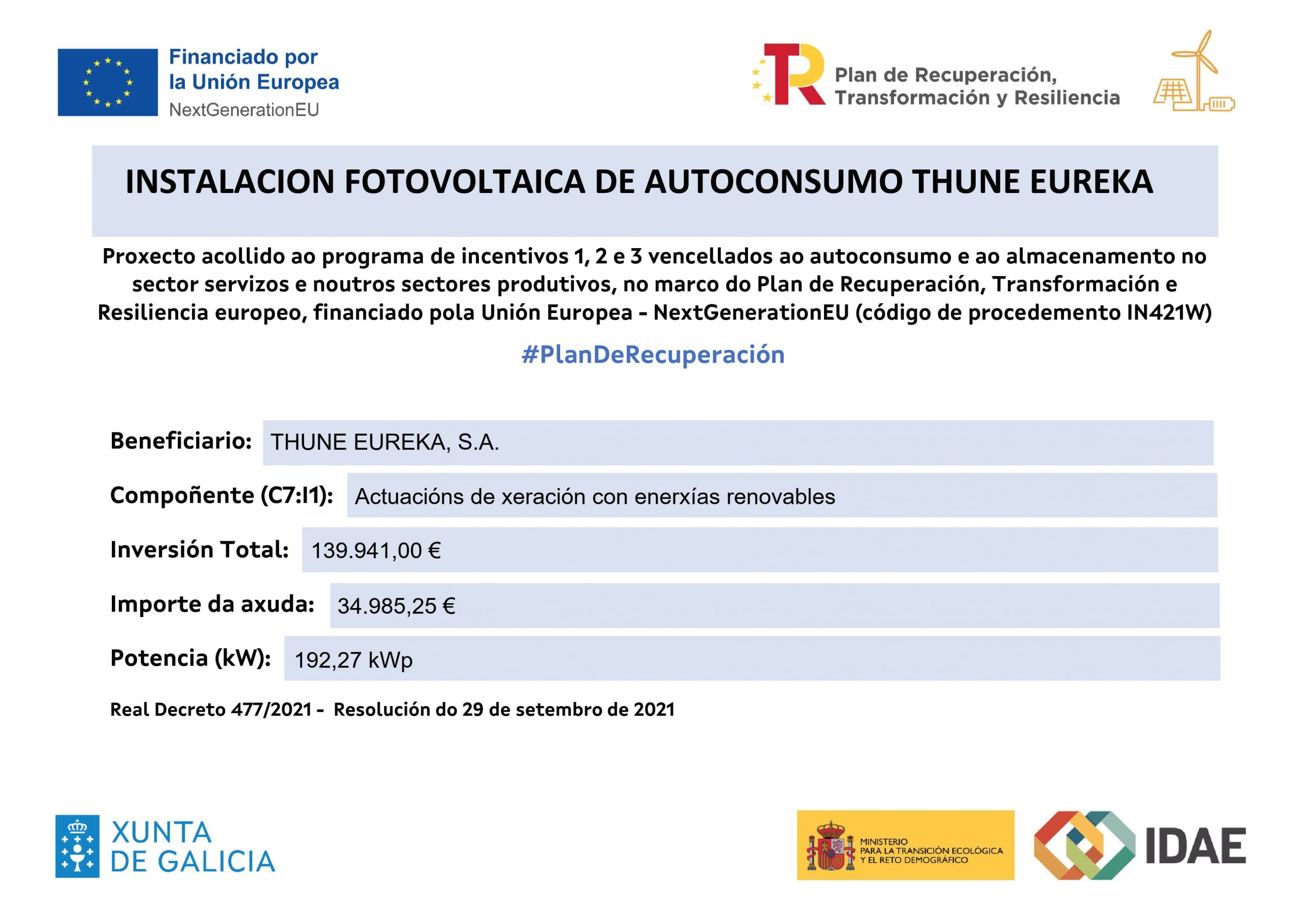 Proyecto de instalación fotovoltaica de Thune Eureka incluido en el programa de incentivos 1, 2 y 3 vinculado al autoconsumo y almacenamiento en sector servicios y otros sectores productivos, en el marco del Plan de Recuperación, Transformación y Resiliencia Europea, financiado por la Unión Europea – NextGenerationEU (código de procedimiento IN421W).